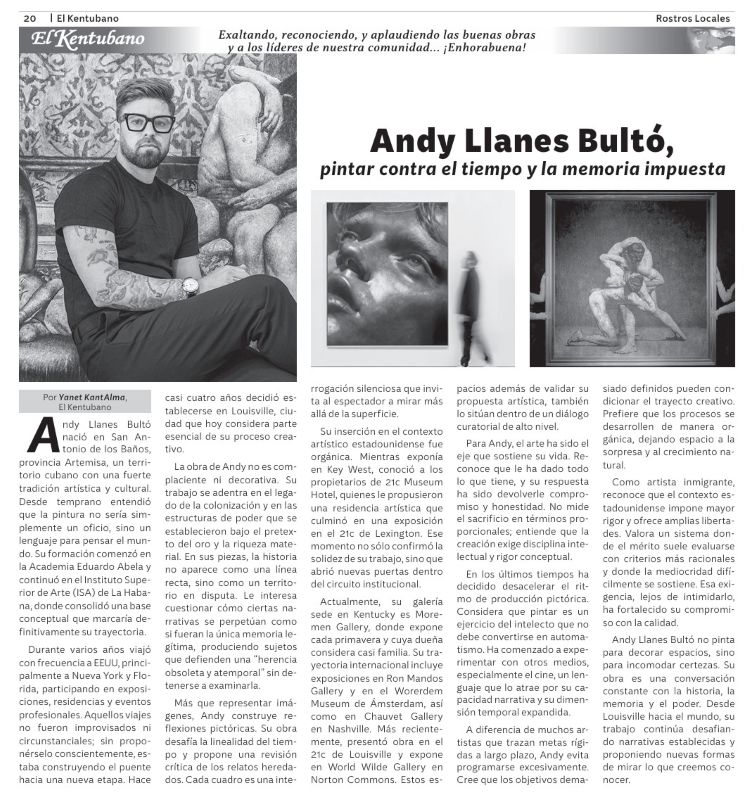 Andy Llanes Bultó nació en San Antonio de los Baños, provincia Artemisa, un territorio cubano con una fuerte tradición artística y cultural. Desde temprano entendió que la pintura no sería simplemente un oficio, sino un lenguaje para pensar el mundo. Su formación comenzó en la Academia Eduardo Abela y continuó en el Instituto Superior de Arte (ISA) de La Habana, donde consolidó una base conceptual que marcaría definitivamente su trayectoria.