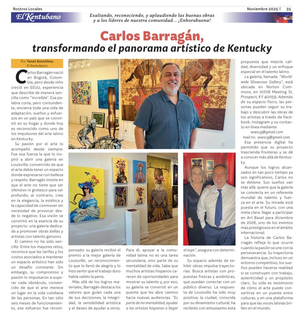 Su pasión por el arte lo acompañó desde siempre. Fue esa fuerza la que lo inspiró a abrir una galería en Louisville, convencido de que el arte debía tener un espacio donde expresarse con belleza y respeto. Barragán insiste en que el arte no tiene que ser ofensivo ni grotesco para ser profundo; al contrario, cree en la elegancia, la estética y la capacidad de conmover sin necesidad de provocar desde lo negativo. Esa visión se convirtió en la esencia de su proyecto: una galería dedicada a promover obras bellas y artistas con talento genuino.