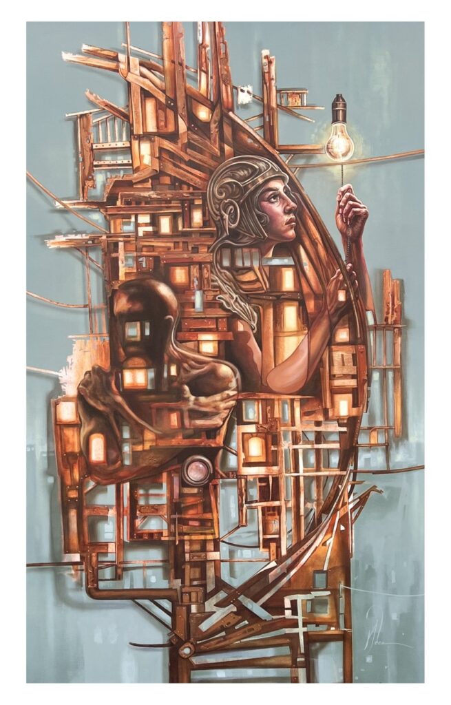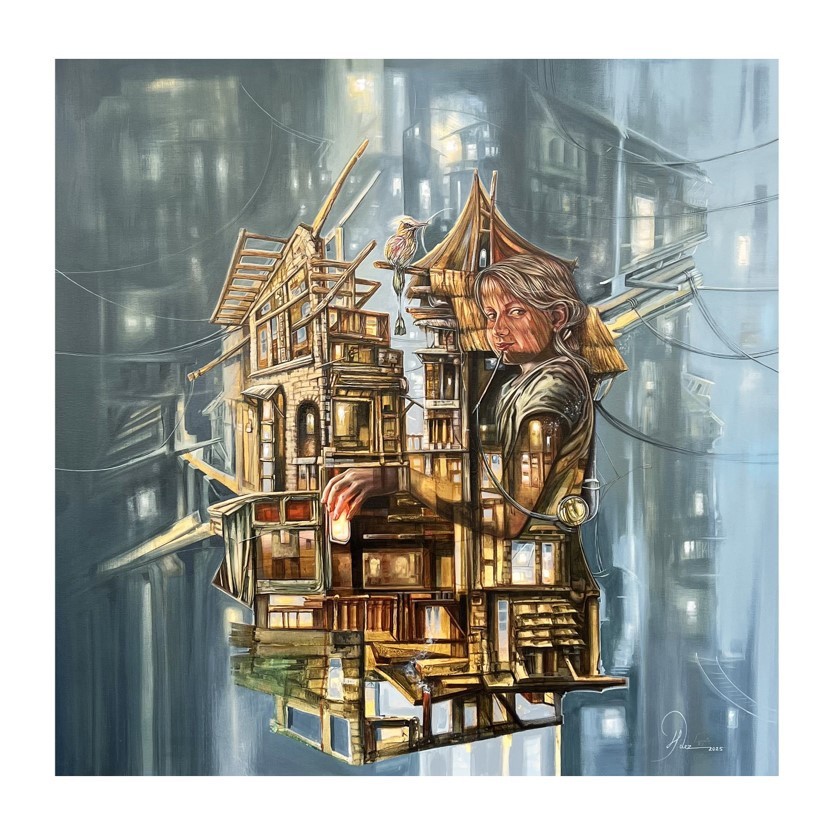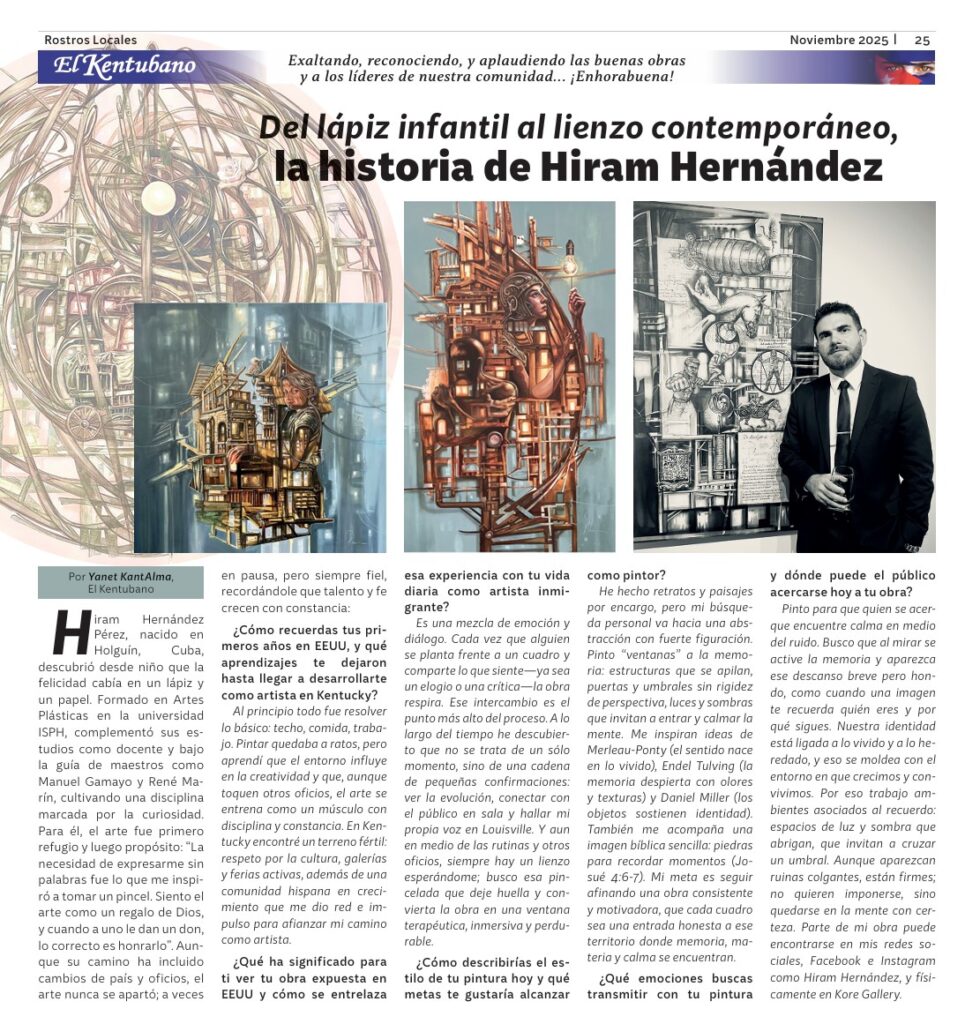Pinto para que quien se acerque encuentre calma en medio del ruido. Busco que al mirar se active la memoria y aparezca ese descanso breve pero hondo, como cuando una imagen te recuerda quién eres y por qué sigues. Nuestra identidad está ligada a lo vivido y a lo heredado, y eso se moldea con el entorno en que crecimos y convivimos. Por eso trabajo ambientes asociados al recuerdo: espacios de luz y sombra que abrigan, que invitan a cruzar un umbral. Aunque aparezcan ruinas colgantes, están firmes; no quieren imponerse, sino quedarse en la mente con certeza. Parte de mi obra puede encontrarse en mis redes sociales, Facebook e Instagram como Hiram Hernández, y físicamente en Kore Gallery.