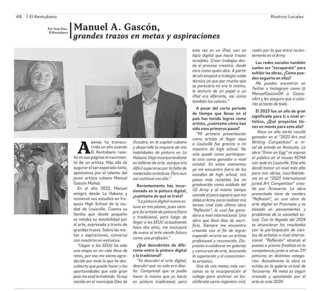 En el año 2022, Manuel emigró desde La Habana y comenzó sus estudios en Iroquois High School de la ciudad de Louisville. Cuenta su familia que desde pequeño se notaba su sensibilidad por el arte, expresada a través de grandes trazos. Sobre las metas y aspiraciones, conversó con nosotros en exclusiva.