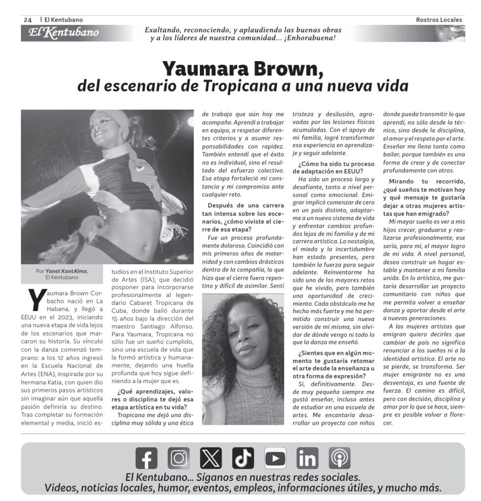 Yaumara Brown Corbacho nació en La Habana, y llegó a EEUU en el 2023, iniciando una nueva etapa de vida lejos de los escenarios que marcaron su historia. Su vínculo con la danza comenzó temprano: a los 12 años ingresó en la Escuela Nacional de Artes (ENA), inspirada por su hermana Katia, con quien dio sus primeros pasos artísticos sin imaginar aún que aquella pasión definiría su destino. Tras completar su formación elemental y media, inició estudios en el Instituto Superior de Artes (ISA), que decidió posponer para incorporarse profesionalmente al legendario Cabaret Tropicana de Cuba, donde bailó durante 15 años bajo la dirección del maestro Santiago Alfonso. Para Yaumara, Tropicana no sólo fue un sueño cumplido, sino una escuela de vida que la formó artística y humanamente, dejando una huella profunda que hoy sigue definiendo a la mujer que es.
