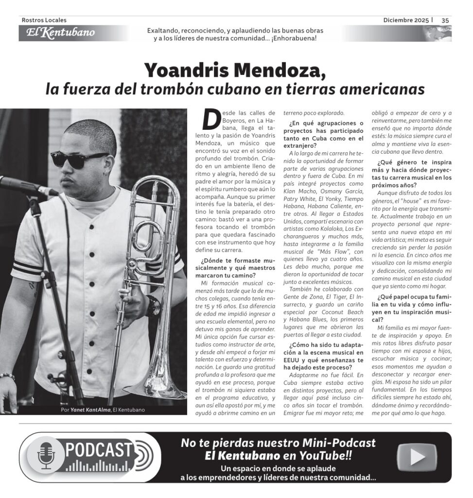 Desde las calles de Boyeros, en La Habana, llega el talento y la pasión de Yoandris Mendoza, un músico que encontró su voz en el sonido profundo del trombón. Criado en un ambiente lleno de ritmo y alegría, heredó de su padre el amor por la música y el espíritu rumbero que aún lo acompaña. Aunque su primer interés fue la batería, el destino le tenía preparado otro camino: bastó ver a una profesora tocando el trombón para que quedara fascinado con ese instrumento que hoy define su carrera.