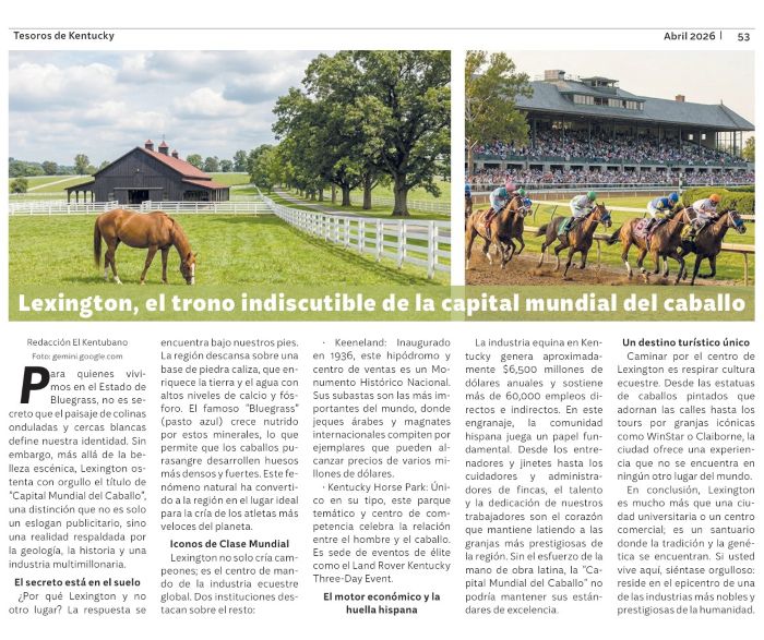 La industria equina en Kentucky genera aproximadamente $6,500 millones de dólares anuales y sostiene más de 60,000 empleos directos e indirectos. En este engranaje, la comunidad hispana juega un papel fundamental. Desde los entrenadores y jinetes hasta los cuidadores y administradores de fincas, el talento y la dedicación de nuestros trabajadores son el corazón que mantiene latiendo a las granjas más prestigiosas de la región. Sin el esfuerzo de la mano de obra latina, la “Capital Mundial del Caballo” no podría mantener sus estándares de excelencia.