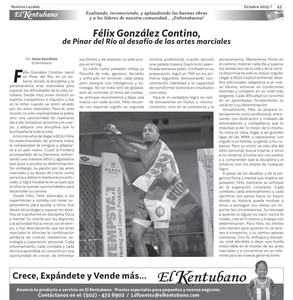 Actualmente, Félix se prepara intensamente como profesional, entrenando con dedicación y rodeado de entrenadores y compañeros que lo impulsan a dar lo mejor de sí mismo. Su meta es clara: llegar a las grandes ligas de las MMA y representar con orgullo a su familia, su gente, a los cubanos. Pero su visión va más allá del éxito personal: busca inspirar a otros a no rendirse, a luchar por sus sueños y a comprender que la disciplina y el esfuerzo son los pilares de cualquier logro.