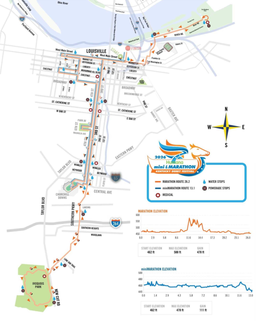 Ambas carreras iniciarán en las calles Main y Floyd, cerca del Slugger Field, y finalizarán en la intersección de Preston y Witherspoon. Un punto crítico ocurre justo después de la milla 9, al salir de Churchill Downs: