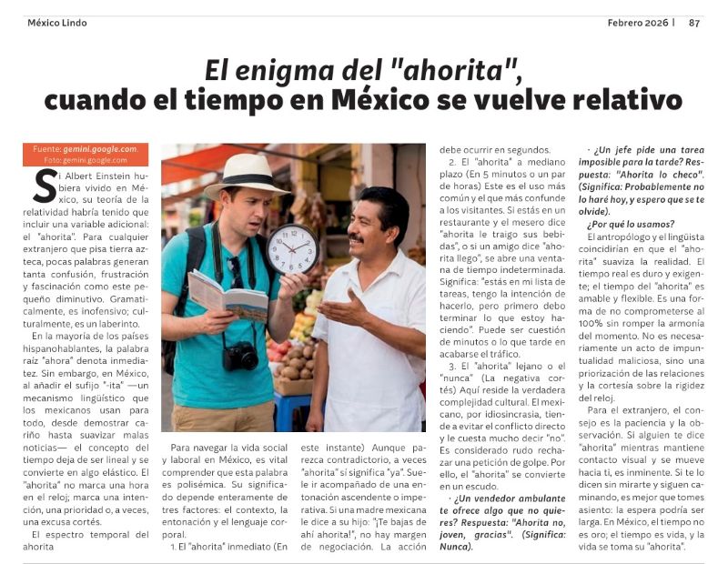 Si Albert Einstein hubiera vivido en México, su teoría de la relatividad habría tenido que incluir una variable adicional: el “ahorita”. Para cualquier extranjero que pisa tierra azteca, pocas palabras generan tanta confusión, frustración y fascinación como este pequeño diminutivo. Gramaticalmente, es inofensivo; culturalmente, es un laberinto.