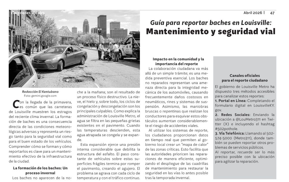 Con la llegada de la primavera, es común que las carreteras de Louisville muestren los estragos del reciente clima invernal. La formación de baches es una consecuencia directa de las condiciones meteorológicas adversas y representa un riesgo tanto para la seguridad vial como para el buen estado de los vehículos. Comprender cómo se forman y cómo reportarlos es clave para un mantenimiento efectivo de la infraestructura de la ciudad.
