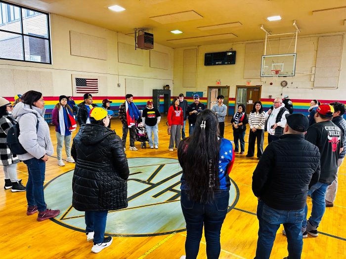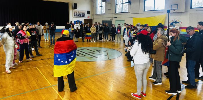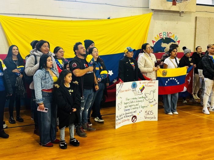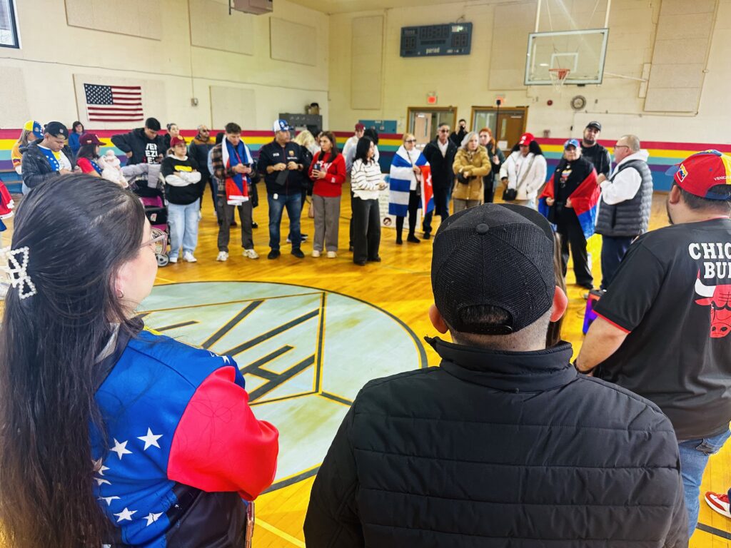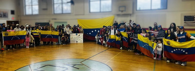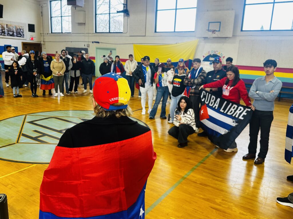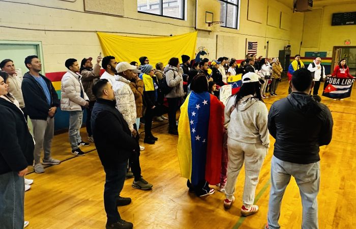 El punto de encuentro fue el Americana Community Center, un lugar emblemático para la población inmigrante de la ciudad. Decenas de personas se dieron cita en la instalación, ondeando banderas tricolores y entonando el himno nacional de Venezuela con visible emoción.
