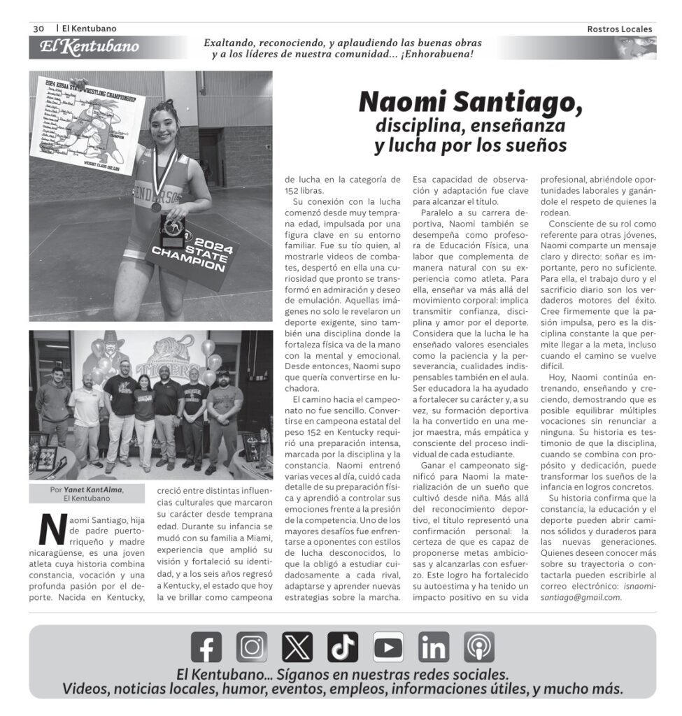 Naomi Santiago, hija de padre puertorriqueño y madre nicaragüense, es una joven atleta cuya historia combina constancia, vocación y una profunda pasión por el deporte. Nacida en Kentucky, creció entre distintas influencias culturales que marcaron su carácter desde temprana edad. Durante su infancia se mudó con su familia a Miami, experiencia que amplió su visión y fortaleció su identidad, y a los seis años regresó a Kentucky, el estado que hoy la ve brillar como campeona de lucha en la categoría de 152 libras.