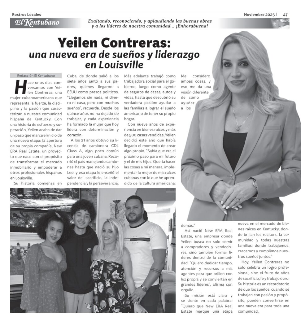 Con una historia de esfuerzo y superación, Yeilen acaba de dar un paso que marca el inicio de una nueva etapa: la apertura de su propia compañía, New ERA Real Estate, un proyecto que nace con el propósito de transformar el mercado inmobiliario y empoderar a otros profesionales hispanos en Louisville.